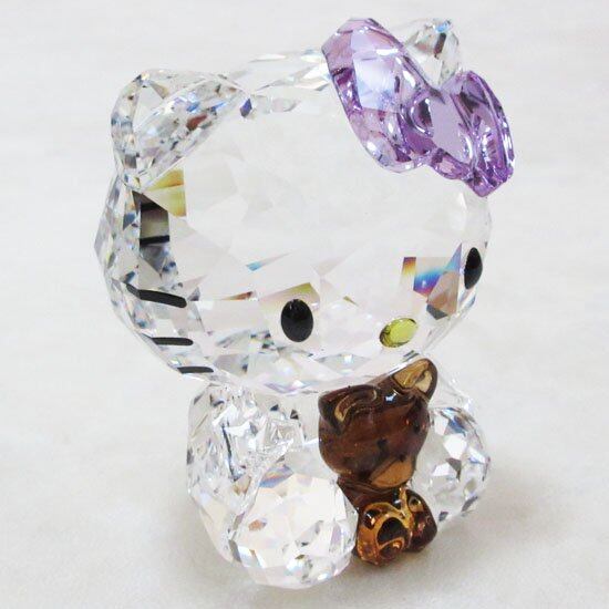 お気に入りのテディベアを抱きしめるハローキティ。リボンはヴァイオレット・クリスタル、鼻はライト・トパーズ、目はジェットクリスタル。ひげはプリントしています。
