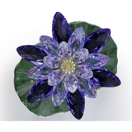 この美しい睡蓮の花にはプロヴァンスラヴェンダー・クリスタル、ブルーヴァイオレット・クリスタルを使用。エリナイト・クリスタルの葉にはクリアクリスタルで水滴をあしらっています。