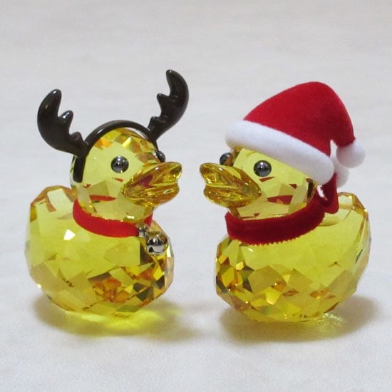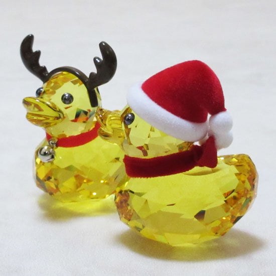 お祝いの雰囲気を演出するアヒルのペア。片方はサンタの衣装と帽子、もう片方はラッカーを施したトナカイの角と布製のネックレス、メタル製のベルを身につけています。(2013.9発売)