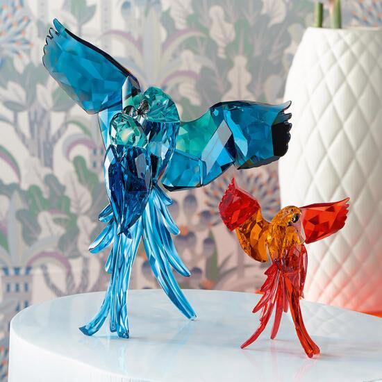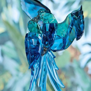クリスタルパラダイス・コレクションの目を奪う一品。熱帯雨林にインスパイアされて作られた、鮮やかなブルーのペアのオウムは、心の絆を象徴しています。クリスタルのみで制作された大型の作品では初めて、台座を使わず自立できるデザインを実現。