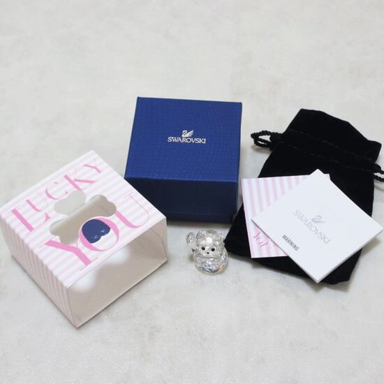 幸運のシンボル、招き猫。ムーンライト・クリスタルのボディにジェット・クリスタルの目と鼻をあしらっています。ベルベット製ポーチ、ギフトカード付。2011年に発売され2014年に廃盤となった人気のフィギュリンです。