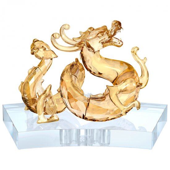 中華圏の新年や辰年の方の誕生日を祝うのにふさわしいアイテム。力強さや栄誉を表現し、縁起のいいカラーとされるゴールドのクリスタルにきらめく約370面のファセットを施しました。北京の中央美術学院のアーティストとのコラボレーションによりデザインされています。曲線を描くクリア・クリスタルの台座は、中国の美術品に見られる?(こう)という扇形の翡翠にインスパイアされ、スワロフスキーのロゴと漢字の「龍」が刻まれています。十二支すべてを並べると、繰り返される人生のサイクルを象徴する円の形になり、古代中国の儀式で使われた工芸品である玉璧(ぎょくへき)を連想させます。十二支に関する小冊子つき。