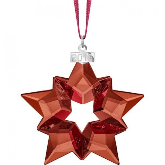 ヒイラギの実とサンタの服のカラーにインスパイアされて、人気の年度限定作品のオーナメントに鮮やかなレッドバージョンが登場しました。光沢のあるメタルタグに「2019」の文字が刻印された、今年のみご購入いただけるアイテムです。サテンエフェクトでアクセントを加えたマグマカラーのクリスタルに約90面のファセットを施し、暖かな魅力のある星形のデザインに仕上げました。レッドのサテンリボンつきなのでツリーや窓辺、テーブルに飾ることができます。